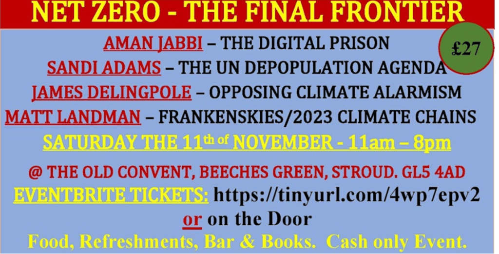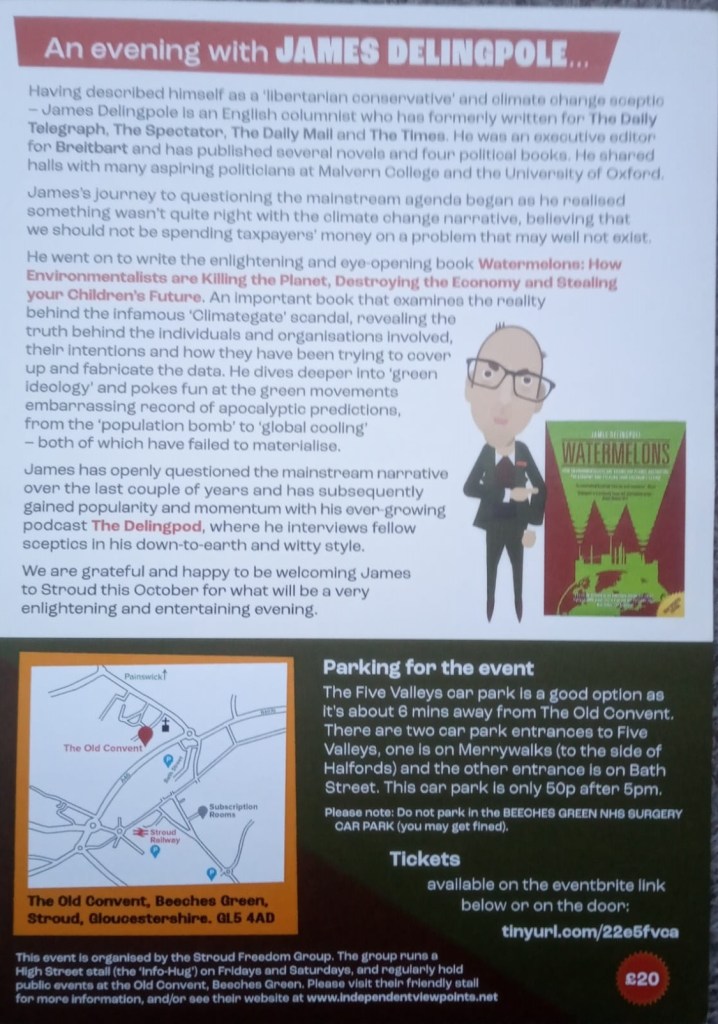 James Delingpole was returning for a second visit despite a previous Community Solidarity Stroud District open letter signed by 217 people. In a 2013 article for the Daily Telegraph, Delingpole talked of the need for a “Climate Nuremberg” directed at climate scientists, activists, and journalists – adding to the climate denialism with a form of Holocaust minimisation/denial (as well as suggesting “George Monbiot be hanged by the neck”). In a 2012 article for The Spectator, Delingpole also used a modernised version of Kulturbolschewismus conspiracy used by Nazis to accuse Jewish intellectuals of degeneracy (translating as “cultural Bolshevism”) to explain the persistence of racism. Since the pandemic, Delingpole has been embracing increasingly extreme conspiracy theories and their politically extreme proponents including Colin Robertson, a white nationalist who has enthused about “torpedo[ing] boats carrying refugees”.