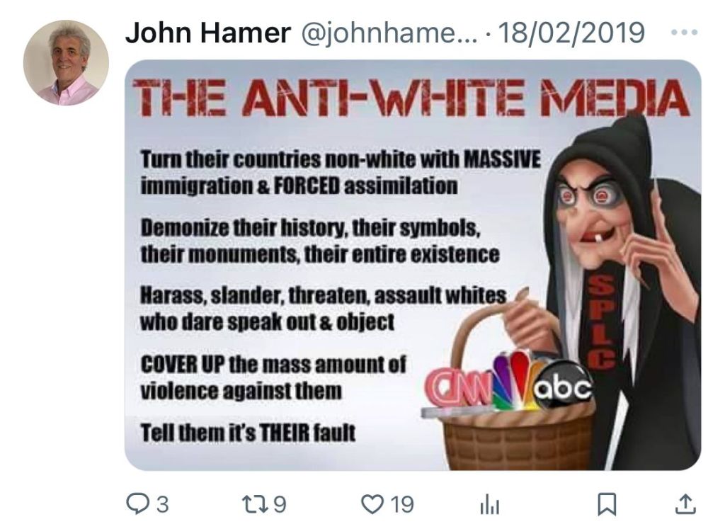 Hamer openly supports white nationalism (which he calls “the ideal”, while also referring to ‘anti-white media’ in a tweet also containing a nasty antisemitic caricature). In the paragraph above you can find links to these tweets on archive.org (which stores the tweets even if Hamer deletes them, and prevents him from getting direct attention to his twitter profile). Below we reproduce the tweets in the form of screenshots. We apologise for the content – skip if if you prefer – but felt it necessary to include to make clear just how committed to his hateful ideas Hamer is. This is not someone who should have been invited to speak in Stroud by anyone.