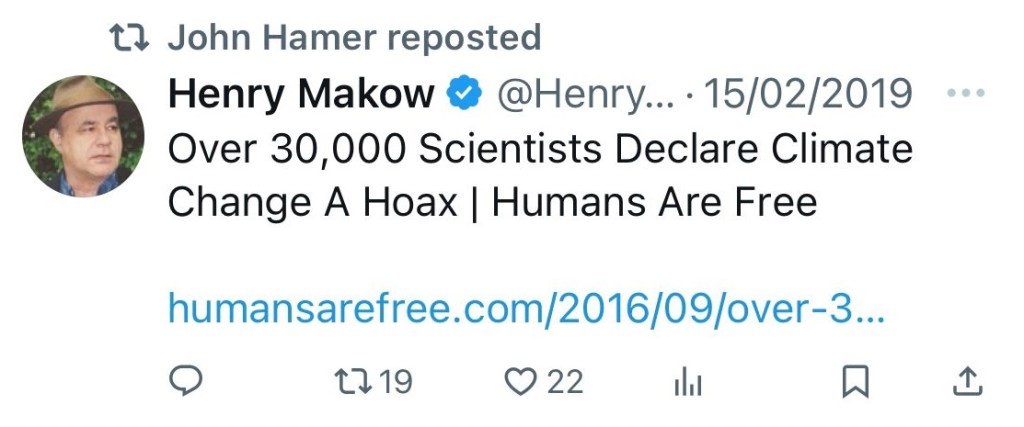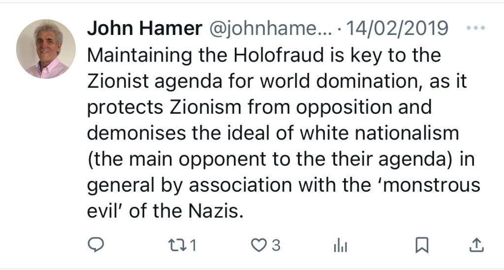 Hamer has sent some really vile tweets showing his Holocaust denial (he refers to the “Holofraud”), conspiracy theories about Jewish people (“Zionist agenda for world domination”), Jo Cox’s murder, and climate change – just for example. His tweet on climate denial is a share of Henry Makow – a Jew-hater we have mentioned previously. His tweet on Jo Cox references disaster troll and conspiracy theorist Richard Hall, who recently lost a court case against survivors of the Manchester Bombings.
