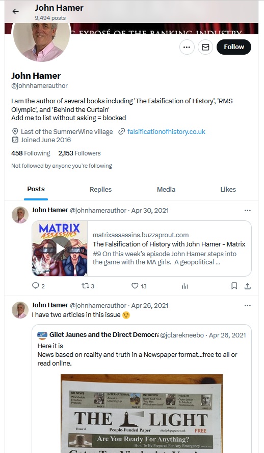 Two of Hamer’s books: The Falsification of History and The Falsification of Science have been described as “reference bibles for conspiracy theory” (by fellow conspiracy theorists).