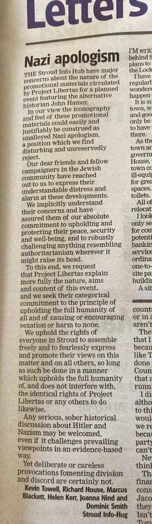 Rather than stating clearly that the publicity material was disgusting, they argued the advert “could easily and justifiably be construed as unalloyed nazi apologism”. They say the find this “disturbing and unreservedly reject” it but… they then suggest that “Project Libertas explain more fully the nature, aims and content of this event”, which seems to suggest they are looking for ways not to reject it. They go on to suggest that “sober historical discussion about Hitler and Nazism may be welcomed, even if it challenges prevailing viewpoints in an evidence-based way”. This is a waffly way to make excuses for Holocaust denial, minimisation, and revisionist history. The “Stroud Info Hub” seems to want to have it both ways – to distance themselves from an obviously objectionable event, while suggesting it should have simply been advertised in a less obvious way, and that similar events would be welcome. Given the paper they hand out has also featured articles by John Hamer, this statement is embarassing at best. There is no recognition of the role these people have played in getting us to this point.