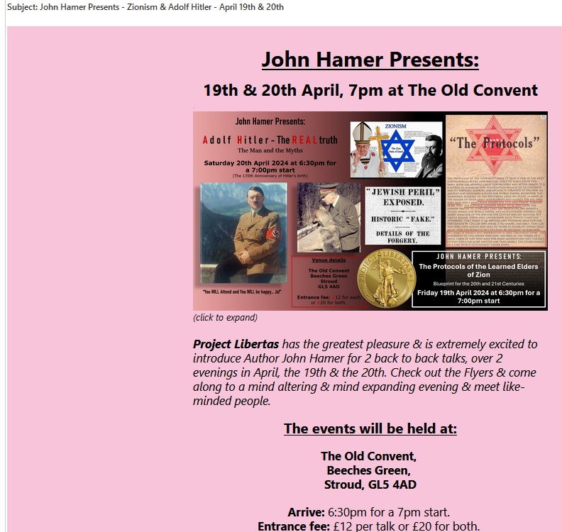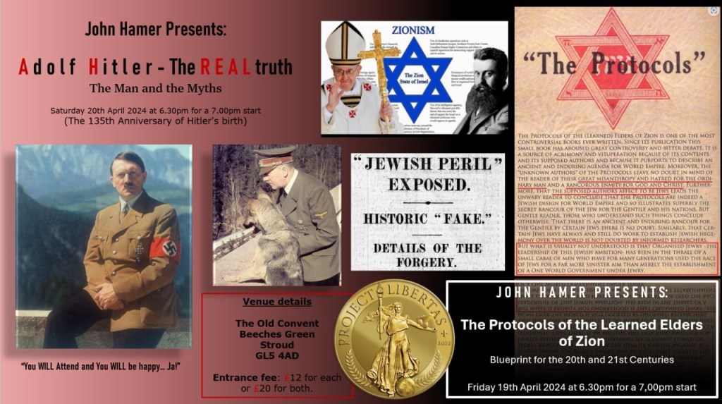 Unfortunately, yes. Shocking as it seems, the advert for the meetings cannot be read any other way. Below we reproduce the graphic used as an advert. The advert was shared in online channels and on an email list run by the group hosting the event, Project Libertas. A content warning – the image below contains two propaganda images of Adolf Hitler – one posing as if to demonstrate strength with a clearly visible swastika armband, another humanising Hitler through his companionship with a dog. The advert also features a piece of text outlining core elements of the antisemitic conspiracy theory of “The Protocols” and a variant of these. The text in one part of the graphic asserts that “there is an ancient and enduring rancour for the Gentile by certain Jews” and talks of “work to establish Jewish hegemony of the world” as if this is a real problem, rather than a paranoid racist fantasy.