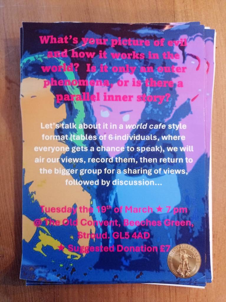 The venue for the events: The Old Convent at Beeches Green in Stroud. This has been the venue for previous Project Libertas events. Their previous meeting was held at the same venue on the 19th March on the theme “What’s your picture of evil and how it works in the world? Is it only an outer phenomena, or is there a parallel inner story”. For many people, one “picture of evil” would be the pictures of Hitler features on their advert for the April events.