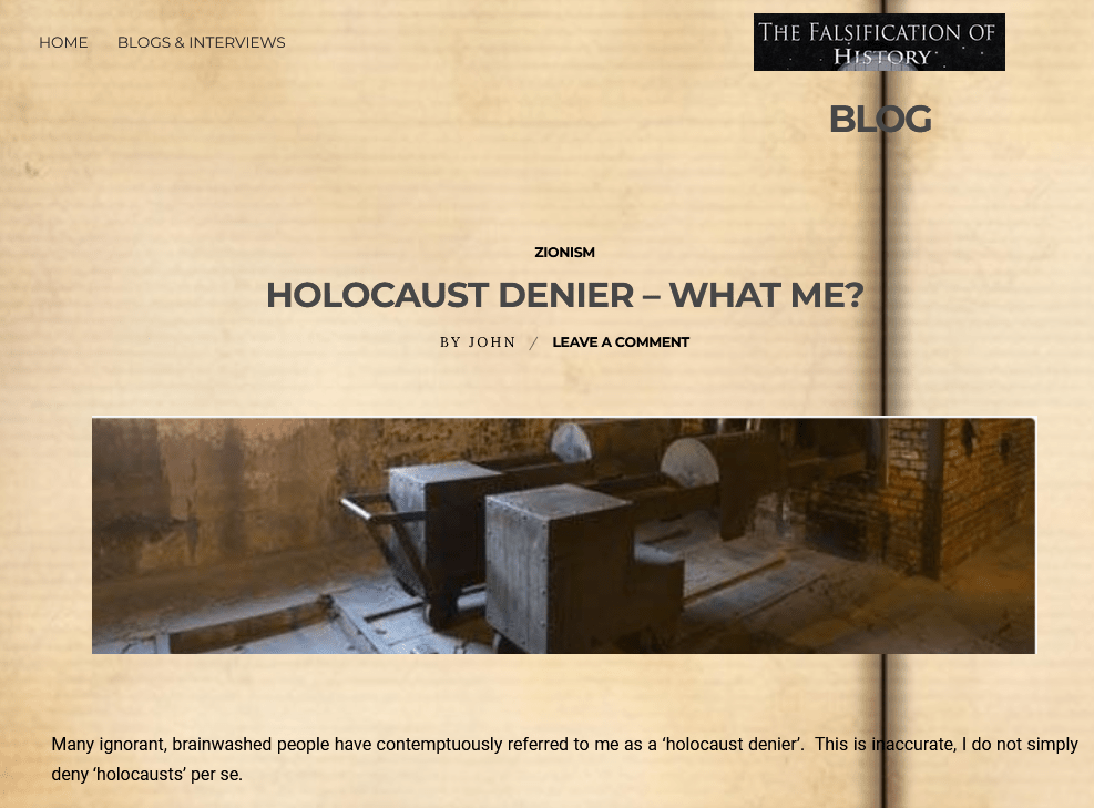 Hamer is a Holocaust denier. On his website was a page dealing with this description, which he notes “many” people have applied to him. We have edited this paragraph to update it – as of 10th June 2024 Hamer has taken this page down from his website. It was there until the 1st June 2024, however, and was stored by the Internet archive – we have also published screenshots below. It had been on his website since at least the 14th May 2024. We believe it was originally posted some time before this, but reposted when Hamer relaunched his website around May this year].