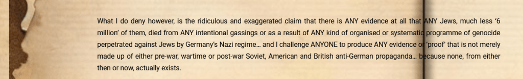 “What I do deny however, is the ridiculous and exaggerated claim that there is ANY evidence at all that ANY Jews, much less ‘6 million’ of them, died from ANY intentional gassings or as a result of ANY kind of organised or systematic programme of genocide perpetrated against Jews by Germany’s Nazi regime… and I challenge ANYONE to produce ANY evidence or ‘proof’ that is not merely made up of either pre-war, wartime or post-war Soviet, American and British anti-German propaganda… because none, from either then or now, actually exists.”