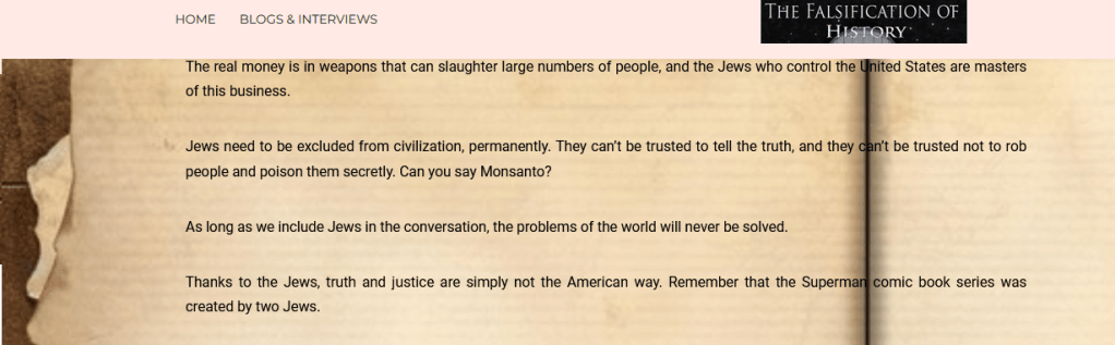 This Nazi-sympathising language is shocking and disgusting. The quotes we have provided here are not isolated, or dated. The two quotes above are from pieces that were posted to the current version of the website on the 14th and 15th May 2024 (the website has clearly been relaunched in April 2024). Among the 40 most recent posts (originally made over a longer period but republished recently), at least 10 contain hatred directed at Jewish people, antisemitic conspiracy theories, and/or Holocaust denial.