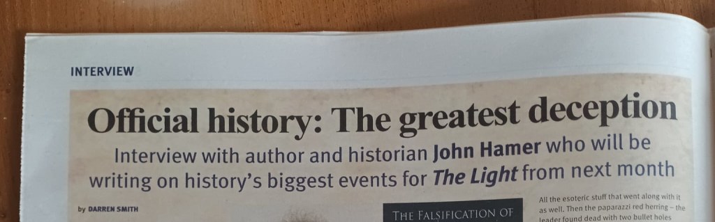 It hasn’t ended there, though. The latest issue of “The Light” announces that the paper will provide Hamer with a regular column “writing on history’s biggest events” in each monthly edition. A full page is given to an uncritical interview of Hamer by the paper’s editor Darren Smith, under the headline “Official history: The greatest deception”, promoting Hamer’s book and online channels.